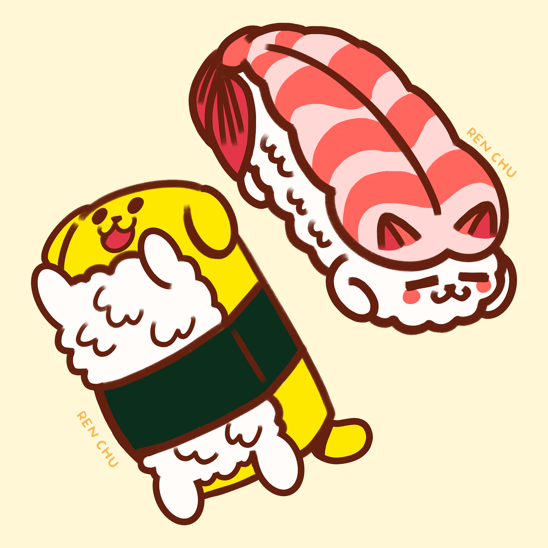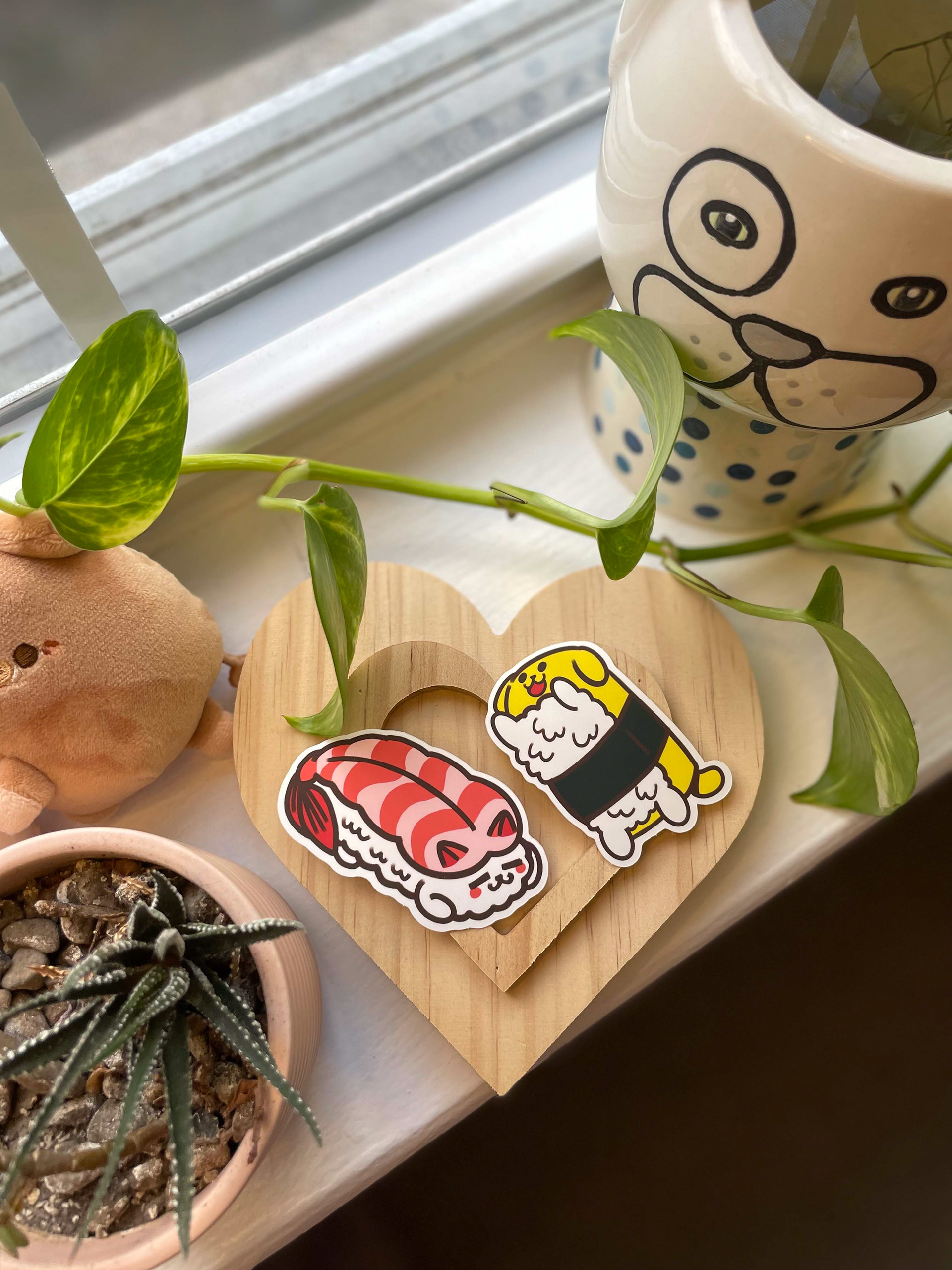 2.5" x 2.5" vinyl, matte stickers of original characters, Ebi Kitty and Tamago Doggo. If you're a sushi lover and have a pet cat or dog, you will love these cute little guys!